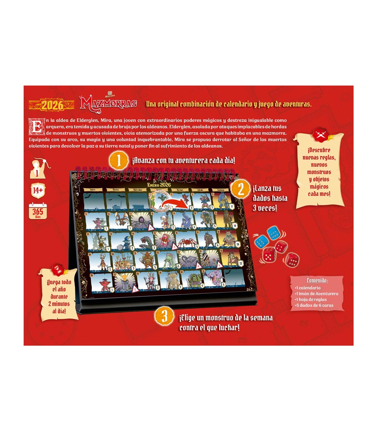 Diseñado por Juhwa Lee e ilustrado por Radja, este calendario está pensado para disfrutar en solitario, a partir de 14 años. Jugar solamente llevará dos minutos al día, pero el desafío completo se prolonga a lo largo de los 365 días del año. Para marcar el día en curso, usarás la figura de la aventurera y un imán en la parte trasera de la hoja del mes.