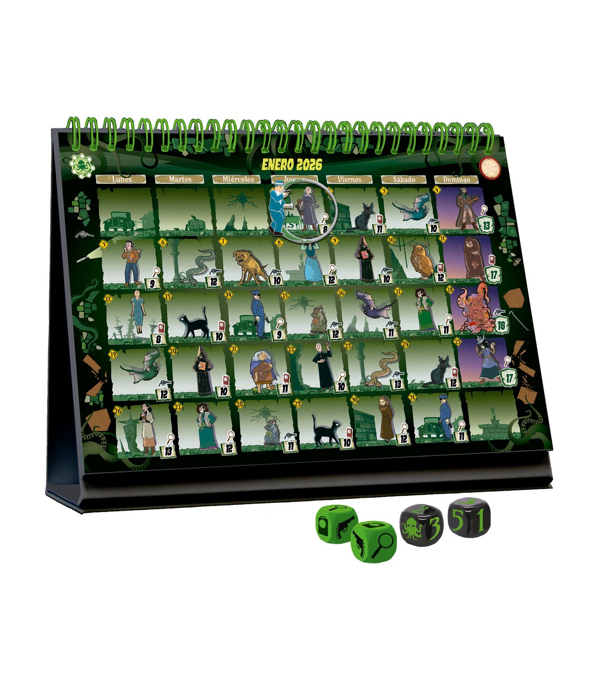 Diseñado por Juhwa Lee e ilustrado por Radja, este calendario está pensado para disfrutar en solitario, a partir de 14 años. Jugar solamente llevará dos minutos al día, pero el desafío completo se prolonga a lo largo de los 365 días del año. Para marcar el día en curso, usarás una figura de investigador y un imán en la parte trasera de la hoja del mes.