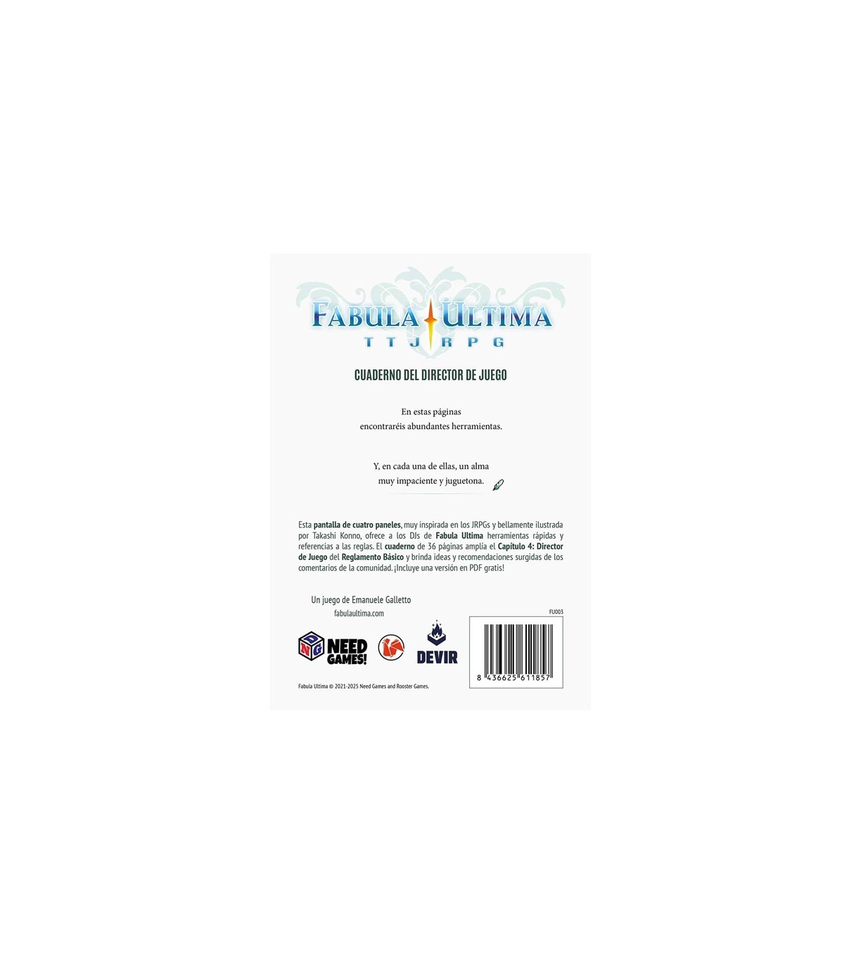 Una pantalla A5 de cuatro paneles diseñada para que los DJ de Fabula Ultima tengan a mano todas las herramientas de creación rápida y referencias de reglas. El Cuaderno del DJ es un volumen que acompaña a la Pantalla del Maestro de Juego de 28 páginas y contiene una serie de consejos y herramientas diseñados para ampliar el Capítulo 4: Maestro de Juego del Manual Básico, ofreciendo ideas y buenas prácticas para todo este diálogo con la comunidad.