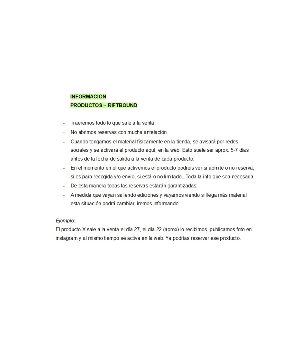 - En el momento en el que activemos el producto podréis ver si admite o no reserva, si es para recogida y/o envío, si está o no limitado...Toda la info que sea necesaria.